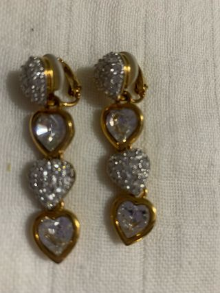 Elegantes pendientes colgantes con diseño de corazones. - Detalles en cristales brillantes. - Acabado en tono dorado.