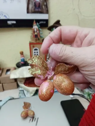 Pendientes llamativos con un diseño único, perfectos para una ocasión especial.Hechos artesanalmente. - Acabado brillante con detalles dorados. - Tonos rosados y dorados. - Diseño con forma de hoja y frutos. Interesados wasap 618483561.Nobse hacen envíos.