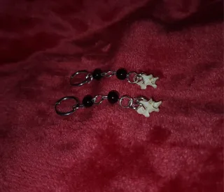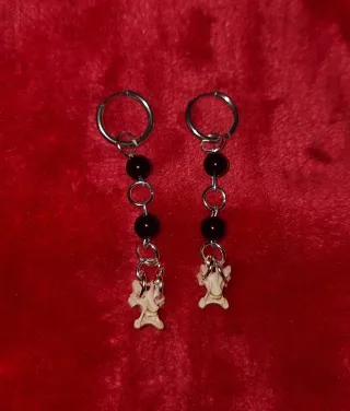 Pendientes hechos a mano, desde cero. Cierre plateado, de acero inoxidable. Con cuentas negras y dos huesos al extremo. Para más información, contactadme por chat. Producto gótico.
