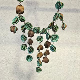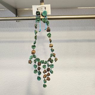 Pendientes largos y llamativos con un diseño de conchas nacaradas. Son perfectos para añadir un toque especial a tu look. - Diseño colgante con múltiples conchas. - Acabado iridiscente con tonos verdes y dorados.