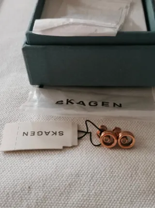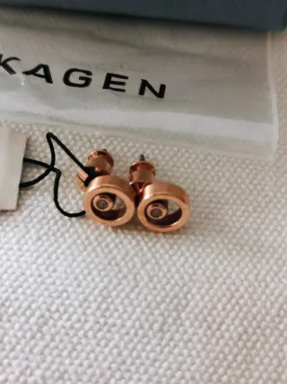 Pendientes de acero inoxidable (antialérgico) en tono rosa dorado con brillantito central. Diseño minimalista y elegante propio de la marca danesa Skagen. Nuevos con etiquetas, certificado y caja original. #skagendenmark #skagen #rosadorado #joyeriaescandinava
