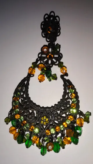 Elegantes pendientes Sevillanos largos con un diseño intrincado y adornos de cuentas. - Diseño con detalles florales. - Cuentas en tonos dorados y verdes. - Estilo chandelier.