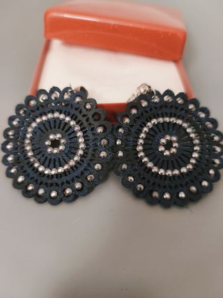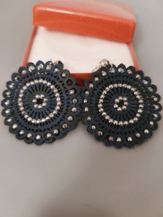 Pendientes con un diseño circular y detalles brillantes. - Diseño tipo mandala. - Adornados con pequeñas pedrerías plateadas. - Cierre de mariposa.