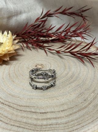 50€ EL CONJUNTO ENTERO. SE PUEDE VENDER POR SEPARADO SI INTERESA. Conjunto de tres piezas de joyería de la marca Tous. - Anillo con diseño detallado. - Pendientes con forma de oso. - Colgante rectangular con filigrana.