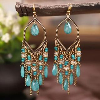 Pendientes largos dorados de mujer con cuentas en color turquesa. Medidas: 10 cm de longitud. NUEVOS A ESTRENAR con su envoltorio. - No negociable. Más artículos en mi perfil 🫠