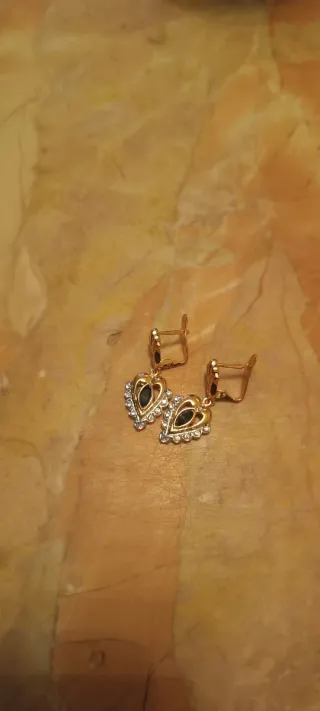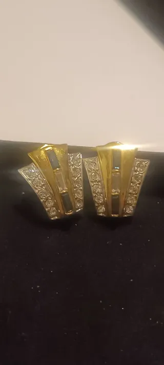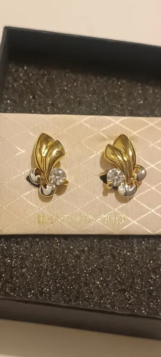 Pendientes completamente nuevos, sin poner ninguna vez. Han sido un regalo de cumpleaños que no se puede cambiar. Elegantes pendientes con diseño y cristales combinado. Cierre metálico a presión - Composición: 55% cristal, 45% latón - Diseño llamativo con múltiples cristales. - Acabado en tono oro.
