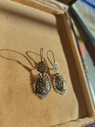 Elegantes pendientes de plata con un diseño intrincado de filigrana y detalles en turquesa. Perfectos para añadir un toque de distinción a tu estilo. - Elaborados en plata. - Adornados con pequeñas piedras turquesas. - Diseño colgante con múltiples elementos decorativos.