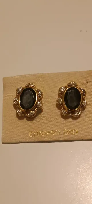 Elegantes pendientes con un diseño clásico y sofisticado. Perfectos para añadir un toque de distinción a cualquier atuendo. - Diseño ovalado con piedra central oscura. - Detalles de pequeñas piedras brillantes alrededor. - Acabado chapado en oro.