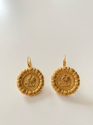 Elegantes pendientes con diseño de gallo, fabricados en acero inoxidable. - Diseño de moneda con gallo. - Borde decorativo texturizado. - Cierre de gancho.