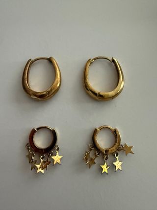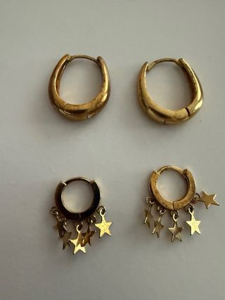 Dos pares de pendientes de la marca Ese o Ese. - Un par de aros lisos. - Un par de aros con estrellas colgantes. - los aros necesitan un baño de color