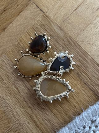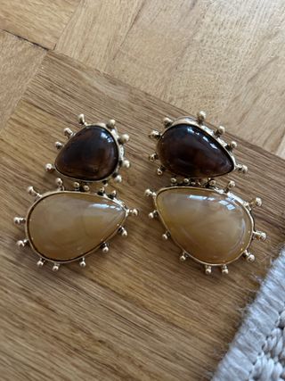 Pendientes con un diseño único y llamativo. - Piedras en forma de lágrima. - Detalle de tachuelas doradas alrededor de las piedras. - Combinación de tonos marrones y beige.