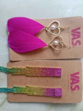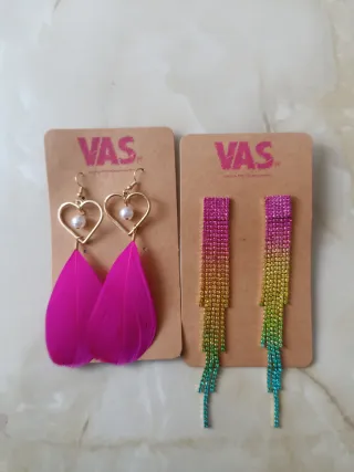 Dos pares de pendientes de la marca VAS. - Pendientes dorados con forma de corazón y perla. - Pendientes largos con plumas fucsia. - Pendientes de cascada con brillantes degradados. Los dos 8€ Individual 3€