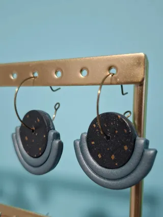 Pendientes de arcilla hechos a mano, con cierre de acero dorado. De tuerca, a presión. Nuevos a estrenar.