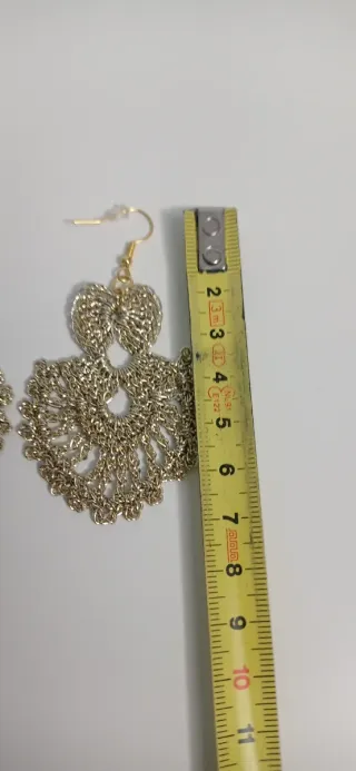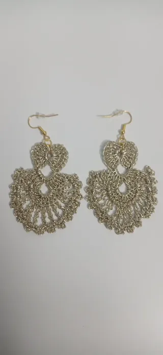 Pendientes hechos a mano con hilo dorado. - Diseño de crochet. - Cierre de anzuelo de acero inoxidable, con tope de silicona