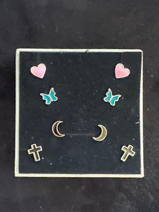 Conjunto de pendientes de bisutería con diseños variados. - Dos pendientes con forma de corazón rosa. - Dos pendientes con forma de mariposa turquesa. - Dos pendientes con forma de luna. - Dos pendientes con forma de cruz.