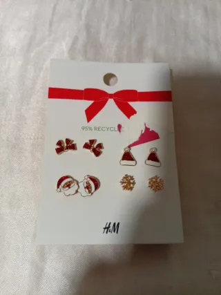 Conjunto de pendientes con temática navideña de H&M. - Diseños variados: lazos rojos, gorros de Papá Noel, copos de nieve. - Detalles en esmalte rojo y blanco. - Acabado dorado.