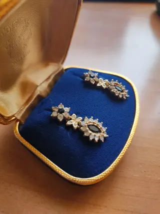 Elegantes pendientes de oro con un diseño moderno y llamativo. - Detalles en circonitas brillantes. - Acentos de piedras. - Acabado en oro. Se venden por no usar en ninguna ocasión,y la caja no sabemos si es la original
