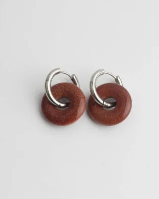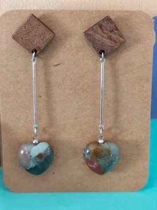 Par de pendientes: - Unos con un diseño rectangular y acabado con vetas marrones y rosadas. Llevan gema verdadera. - El otro con diseño circular y de color azul y plateado.