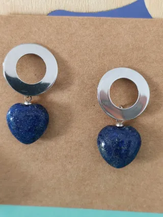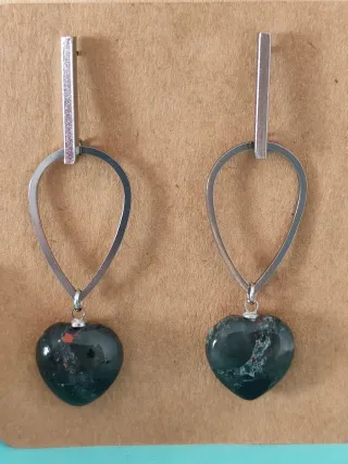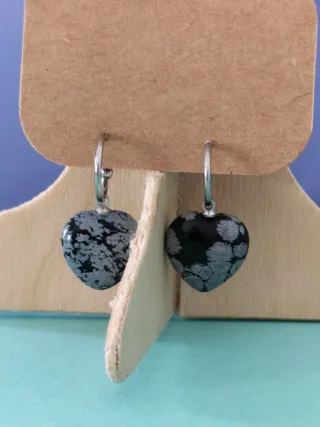 Pendientes artesanales de acero inoxidable y piedras semipreciosas naturales talladas en forma de corazón. Nombre por orden de foto: Amatista Cuarzo rosa Obsidiana copo de nieve Lapislázuli Amazonita