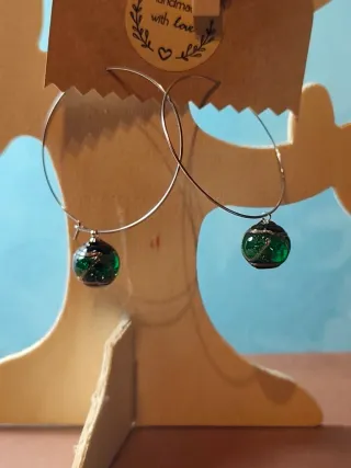 Conjunto de pendientes hechos a mano con detalles en resina UV y cristal de Murano. - Pendientes con aros dorados. - Cuentas de cristal de Murano con incrustaciones plateadas. - Cierre de plata.