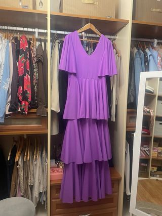 Vestido morado con un diseño de tres volantes , mantoncillo y pendientes. - Escote en V. - Mangas acampanadas o mariposa - Diseño de tres niveles. - Tejido elastico muy comodo. - Talla 40 /42. - Mantoncillo de seda flecado a mano. - Regalo bonitos pendientes. - Me costo 90€ el vestido solo. - Se puede ver en las ultimas fotos. - Se ha usado en 2 ocasiones. - Está impecable. - Precio algo negociable.