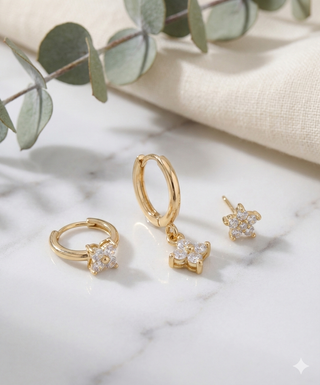 ¿Buscas el toque de brillo perfecto para tu look diario o una ocasión especial? 🌸 Vendo este precioso conjunto de 3 pendientes minimalistas con diseño floral. Son elegantes, versátiles y están diseñados para durar. Ideales para combinar si tienes varios agujeros o para usar por separado. Detalles de la joya: Contenido: Set de 3 piezas (1 aro con charm de flor, 1 aro con flor integrada y 1 pendiente de botón/piercing tipo flor). Material: Acabado en oro de 18K de alta calidad (no pierde el brillo fácilmente). Piedras: Circonitas cúbicas premium engastadas que captan la luz de forma espectacular. Estilo: Minimalista, boho-chic