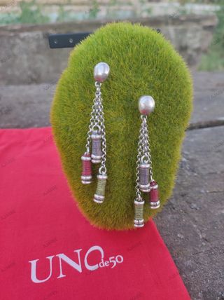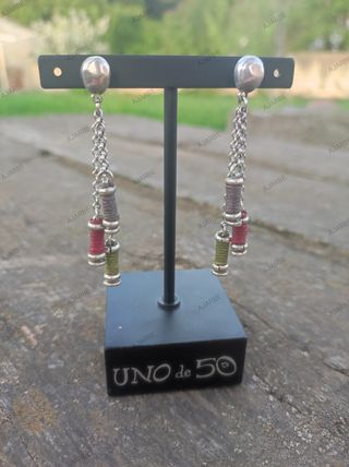 Pendientes largos de la marca española Uno de 50 modelo vintage con 3 pequeños carretes de hilo de colores colgantes. Envío en bolsita de organza a cargo del comprador. No se admiten devoluciones.