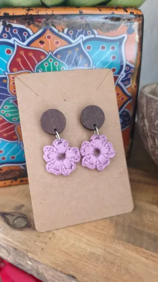 Pendientes hechos a mano con un diseño floral delicado. - Detalle de flor de crochet en color morado. - Base circular de madera en tono marrón. -3-4cm largo.