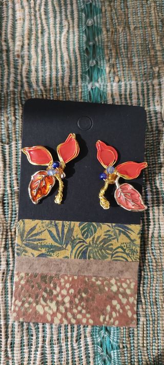 Pendientes Hojas Doradas con Flores Rojas