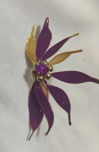 Pendientes llamativos con diseño de flor. - Pétalos en esmalte morado y dorado. - Centro con cuentas doradas y piedra morada. - Cierre seguro.