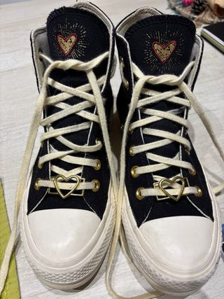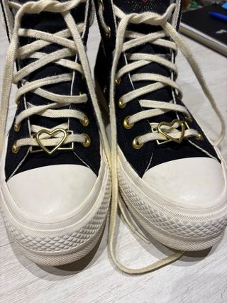 Zapatillas altas Converse Chuck Taylor All Star Lift con plataforma y detalles de corazones. - Diseño en color negro, con goma beige y con bordado de corazón dorado en la lengüeta y parte trasera. - Adorno metálico en forma de corazón en los cordones. - Plataforma elevada para un estilo único. Como nuevas, solo dos usos.