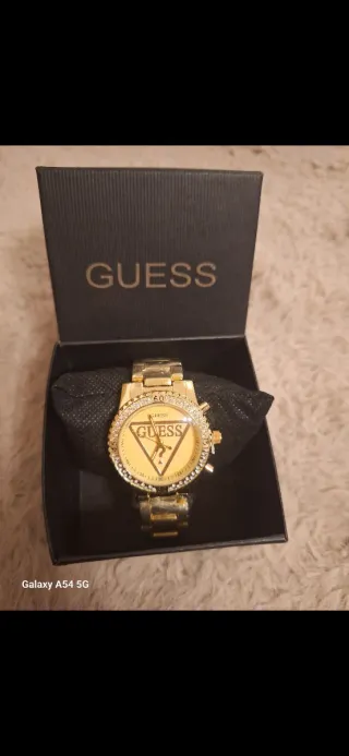 Elegante reloj de la marca Guess con un acabado dorado brillante y detalles de cristales alrededor de la esfera. - Diseño llamativo con el logo de Guess en el dial. - Bisel adornado con cristales. - Brazalete metálico a juego.