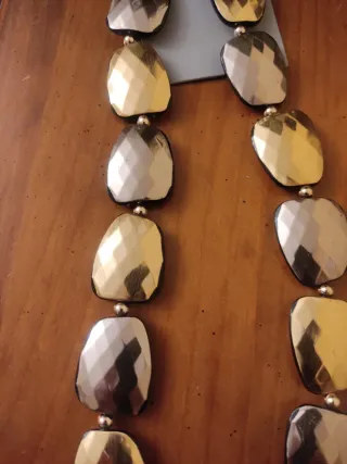 Elegante collar con cuentas facetadas en tonos dorados y plateados. Un accesorio llamativo para complementar tu estilo. - Diseño con cuentas grandes y brillantes. - Combinación de colores versátil.