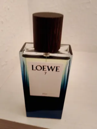 Este perfume Loewe 7 Elixir para hombre presenta un diseño elegante y moderno. - Frasco con degradado azul y detalles en marrón. - Tapa de madera oscura.