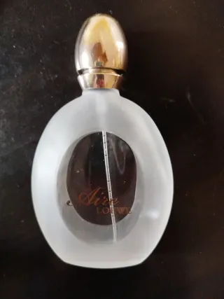 Frasco de perfume Aire de LOEWE. - Diseño ovalado y translúcido. - Tapa dorada y plateada.