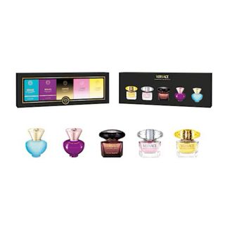 Conjunto de 5 miniaturas de perfumes de la colección Versace. Cada frasco contiene 5 ml de fragancia: - Versace Dylan Turquoise pour Femme Eau de Toilette 5ml - Versace Dylan Purple pour Femme Eau de Parfum 5ml - Versace Crystal Noir pour Femme Eau de Toilette 5ml - Versace Bright Crystal pour Femme Eau de Toilette 5ml - Versace Yellow Diamond pour Femme Eau de Toilette 5ml Precio en perfumerías Julia: 59€