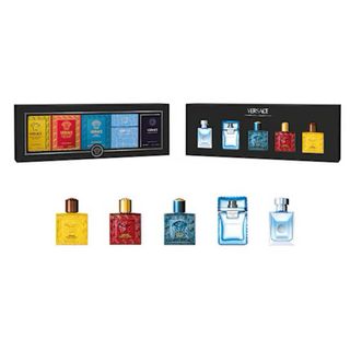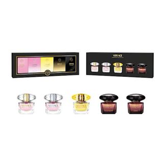 Set de viaje Versace con miniaturas de 5 ml que ofrece fragancias para cada ocasión: Dylan Purple y Bright Crystal para ella y Eau Fraiche, Pour Homme y Eros Eau de Toilette para él. Ideal para descubrir la diversidad y el estilo icónico de la marca.