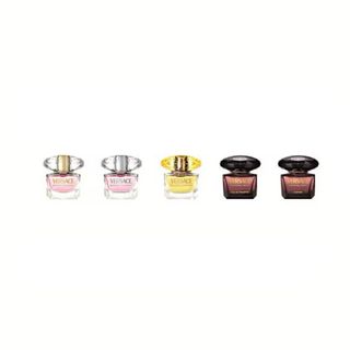 Conjunto de 5 miniaturas de perfumes Versace para mujer. El set contiene: 5 ml de Dylan Turquoise EDT, 5 ml de Dylan Purple EDP, 5 ml de Crystal Noir EDT, 5 ml de Bright Crystal EDT + 5 ml de Yellow Diamond EDT.