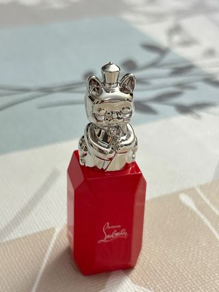 Miniatura del perfume Loubidoo de Christian Louboutin. - Contiene 9ml de fragancia. - Diseño icónico con tapa plateada en forma de gato y base roja. - Ideal para coleccionistas o para llevar en el bolso.
