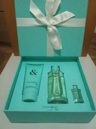 Set de fragancia Tiffany & Co. Love. - Loción corporal perfumada 100 ml. - Perfume en presentación grande 90 ml. - Miniatura de perfume 5 ml. - Caja de regalo Tiffany & Co. con lazo.