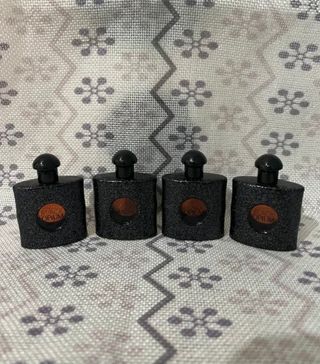 Set de cuatro miniaturas de perfumes de Yves Saint Laurent. - Incluye Libre, Mon Paris, Black Opium y Tuxedo. - Botellas de cristal con detalles dorados y negros. - Ideal para coleccionar o probar diferentes fragancias.