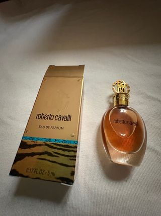 Miniatura del perfume Roberto Cavalli Eau de Parfum. - Descatalogada, para coleccionistas - Diseño elegante con detalles dorados. - El frasco tiene un tono anaranjado. - Incluye la caja original con estampado de tigre.