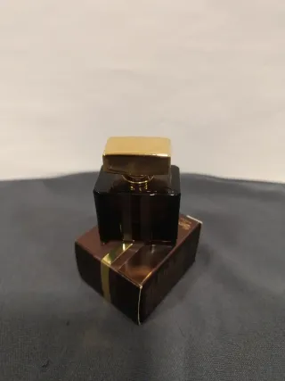 Miniatura de perfume de la marca Gucci. El frasco es de cristal negro con un tapón dorado. - Diseño elegante con detalles en dorado y marrón en la caja.