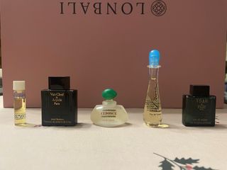 Lote variado de cinco miniaturas de perfumes de la marca Van Cleef & Arpels. Incluye diferentes fragancias. - Pour Homme Eau de Toilette 7ml (85% Vol.) - TSAR Eau de Toilette 7ml (0.24 fl.oz. 85% Vol.) - CEDOSCE Eau de Toilette - Aura Eau de Toilette - Miniatura de perfume sin etiqueta visible. - Se vende a 10€ la unidad pero se puede hacer un lote con mas de la misma marca si hay o con otras marcad juntas. Si se compran muchas unidades se podria aplicar un pequeño descuento. -