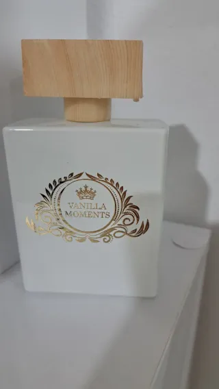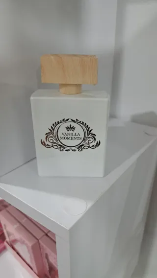 Elegante frasco de perfume con un diseño moderno y un tapón de madera. - Frasco de vidrio blanco. - Detalle de etiqueta Vanilla Moments con corona. - Tapón de madera natural.