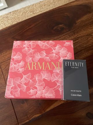 Conjunto de perfumes de las marcas Armani y Calvin Klein. - Caja de regalo Armani con diseño floral. - Perfume Eternity for Men de Calvin Klein.