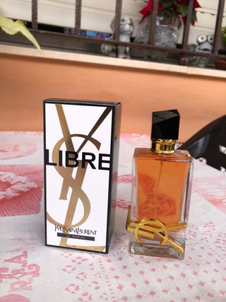 Este es el perfume Yves Saint Laurent Libre Le Parfum. - Envase de cristal con detalles dorados. - Líquido de color naranja intenso.