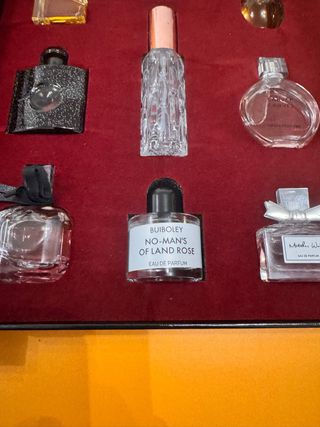Conjunto de 9 mini perfumes para mujer, ideal para probar diferentes fragancias. El set incluye una variedad de aromas. - No-Man's of Land Rose de Buiboley Eau de Parfum - Mad W Eau de Parfum - Botella de perfume negra con detalles plateados - Botella de perfume transparente con tapa dorada - Botella de perfume transparente con detalles - Botella de perfume transparente con cinta negra - Botella de perfume transparente con tapa plateada - Botella de perfume dorada - Botella de perfume transparente con tapa dorada