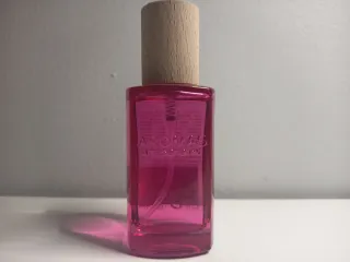 Este perfume ARTESANAL de mujer tiene un aroma frutal y un envase de cristal rosa. - Botella con atomizador. - Tapa de madera.