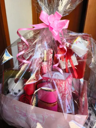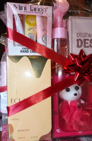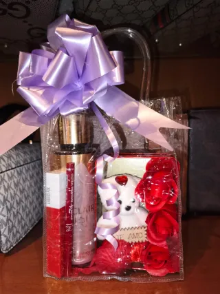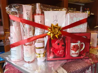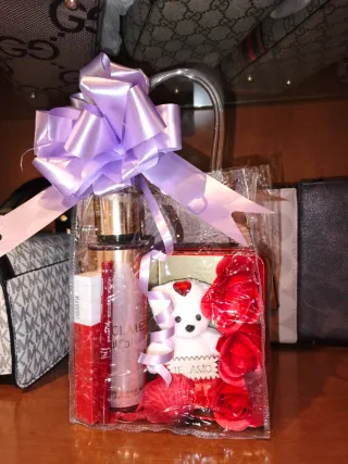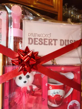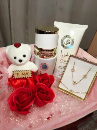 Precioso set de regalo ideal para San Valentín. Contiene varios artículos decorativos y de cuidado personal. - Caja decorada con lazo rojo. - Osito de peluche con corazón. - Flor de rosa artificial. - Perfume o loción. - Otros artículos de belleza.
